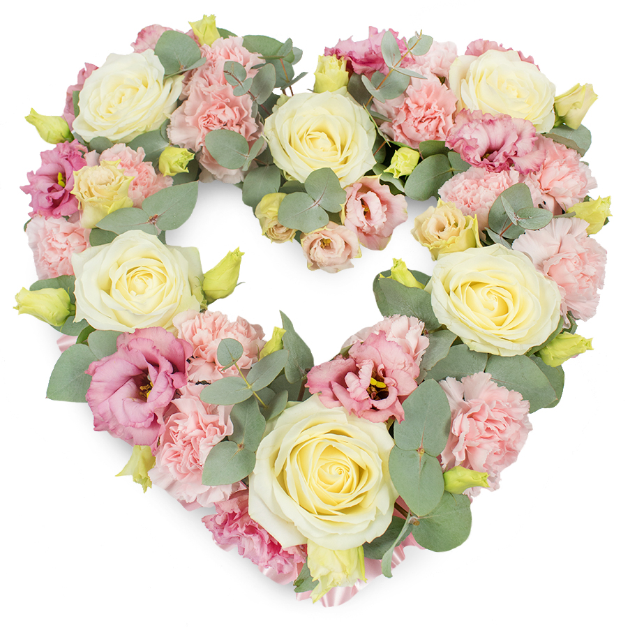 Express your gratitude and love with our Sophisticated Open Heart display. This elegant bouquet combines white roses, pink carnations, pink lisianthus, and eucalyptus leaves, artistically arranged to create a memorable tribute.